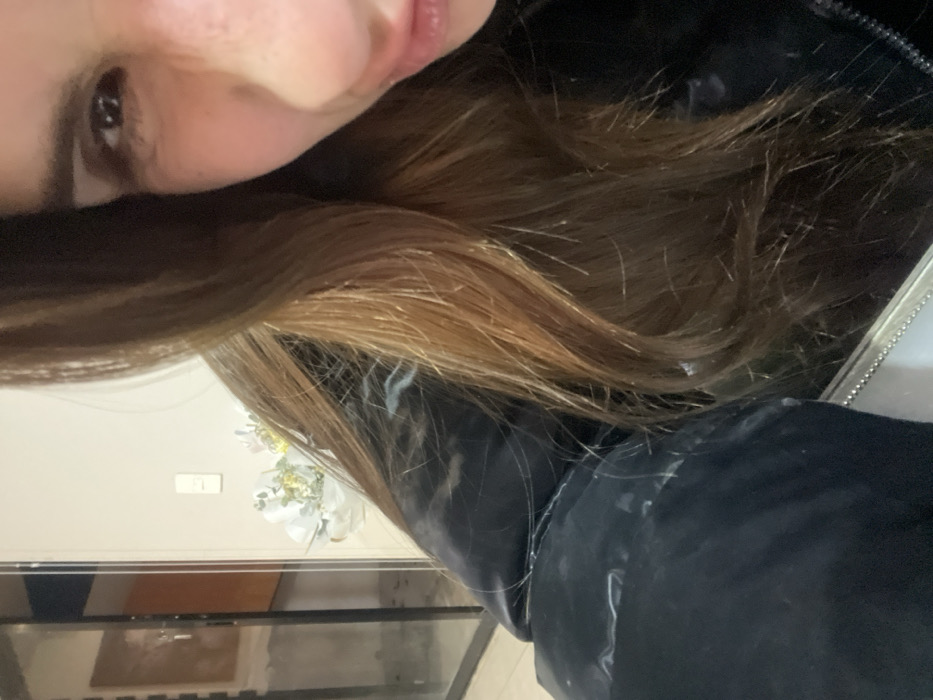 A close-up shot reveals part of a face including an eye and lip. The individual has brown hair with blonde highlights framing the face. A black, shiny material appears in the lower right of the frame. The background includes a dimly lit interior, with hints of furniture and a floral arrangement. A light switch is visible on the wall. The photograph is angled, giving a slightly skewed perspective.