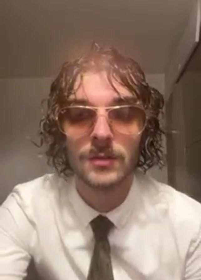 A man with curly brown hair and a mustache is wearing sunglasses, a white button-down shirt, a brown tie, and black pants. He is standing in a room with light-colored walls and is looking directly at the camera. He moves back to reveal more of his body. A couch is partially visible in the background.
