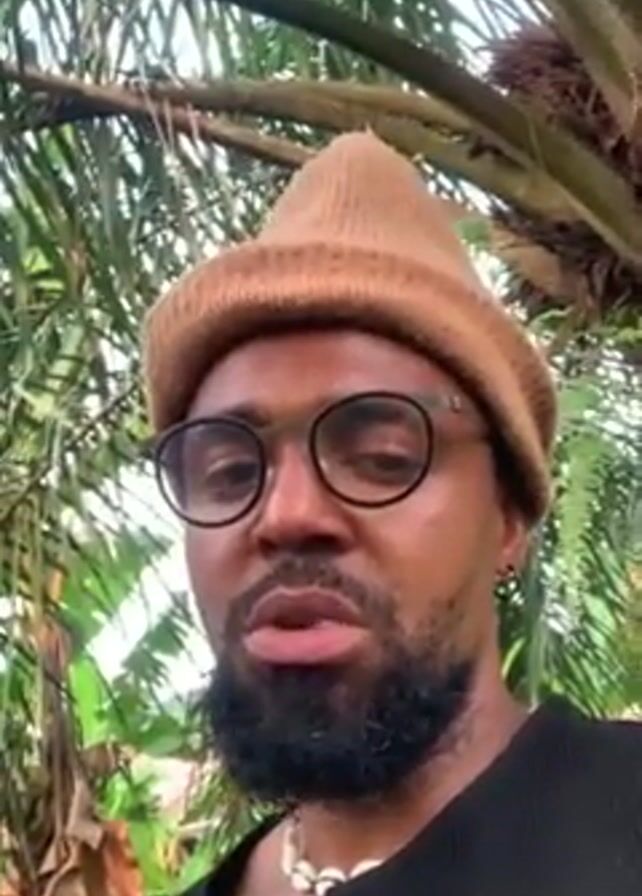 A medium shot captures a bearded person wearing glasses and a brown knitted cap, positioned in front of a palm tree