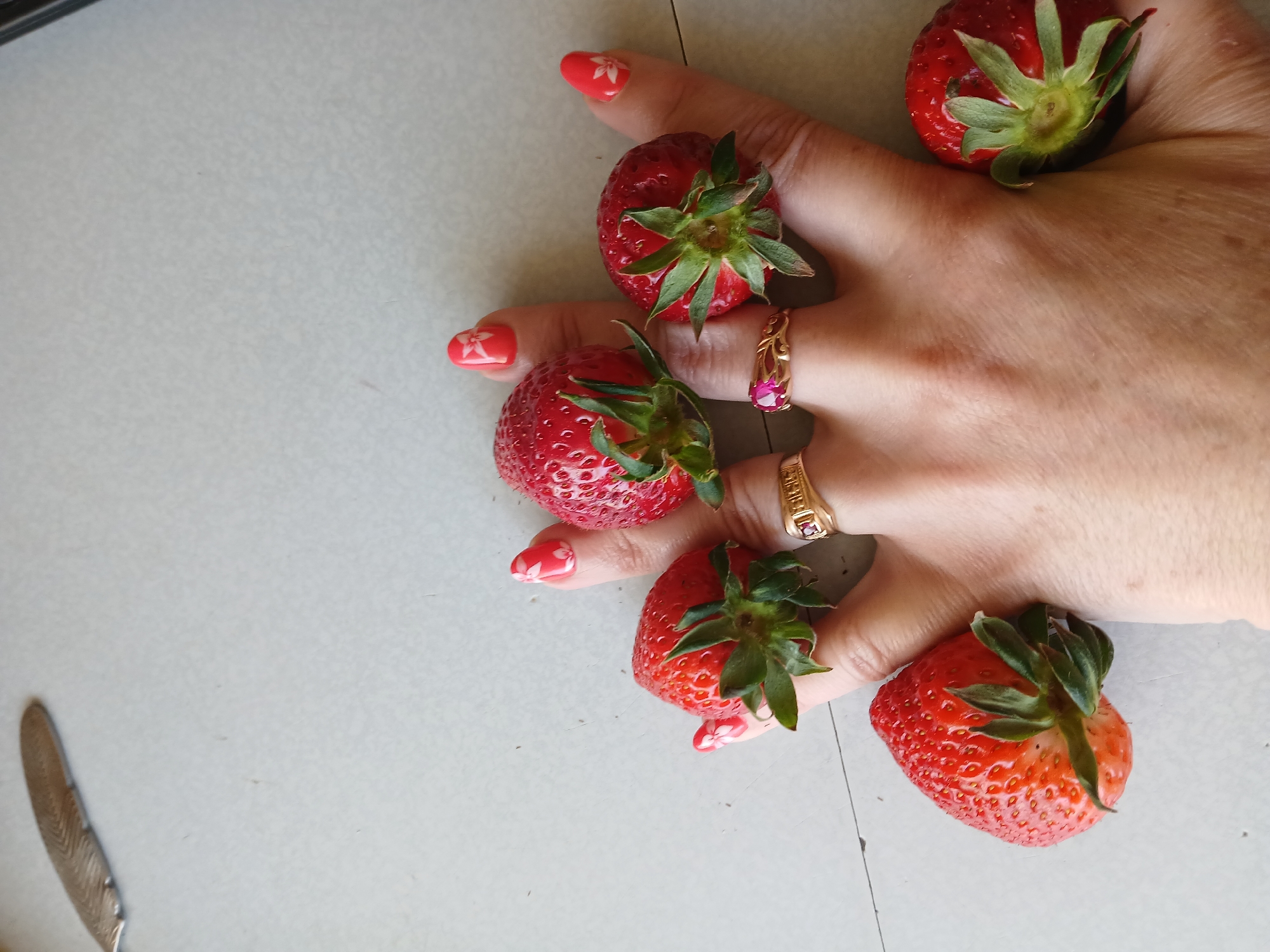A hand with painted nails and two rings holds five strawberries with green tops. The hand is on a white surface next to a silver object resembling a knife.