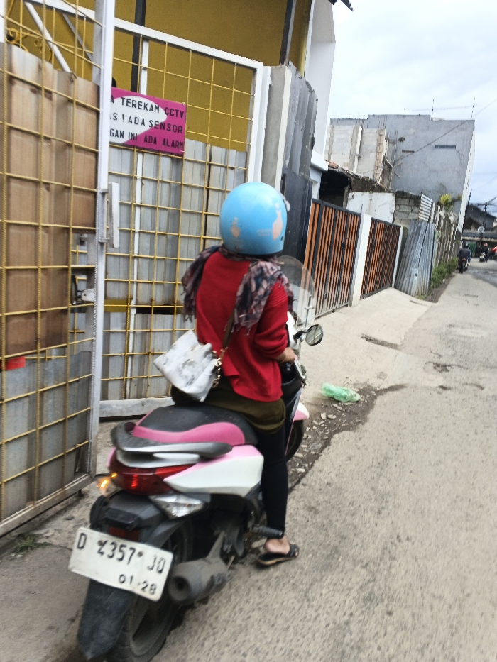 A person wearing a light blue helmet, a red long-sleeved top, dark bottoms, and black leggings is seated on a white and pink scooter on a paved road in Margahayu, Indonesia