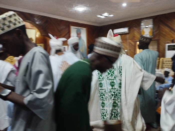 group of men in a room in Kaltungo, Nigeria, located at coordinates 9.816 latitude and 11.315 longitude. The men are all wearing traditional clothing, some with white robes and others with green and white robes. They are standing in a group, some with their hands raised, appearing to be in a state of prayer or in a celebratory gathering. The room is decorated with wooden paneling and has a few framed portraits on the walls. The ceiling has recessed lighting. The men are positioned in front of a partially visible doorway and a window, with a framed portrait of a man in a white robe and a hat hanging on the wall in the background. The focus is on the man in the center of the image, wearing a white robe with a green patterned vest, who is being surrounded by other men. There is a man on the left edge of the image who is partially facing the camera, looking away from the group with his hands outstretched as he speaks to the group. There is a doorway with an arch on the left side of the room, and a wall with wooden panels and a framed portrait above the doorway. The image is slightly blurry, suggesting it was taken quickly or perhaps there is a slight motion blur. The image appears to be taken from the perspective of a witness of the event, capturing a moment of religious ritual or a ceremonial celebration.