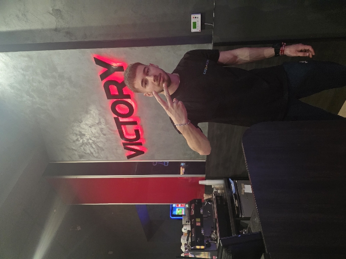 A young adult male is depicted standing indoors within a commercial establishment in the city of Dolni Chiflik, Bulgaria. He has short, light brown hair, a trimmed beard, and is wearing a black t-shirt with a light-colored logo on the left chest, and dark athletic pants. On his left wrist, he wears a silver chain-link bracelet, and multiple dark-colored bracelets adorn his right wrist. He faces the camera directly, extending his right hand in a peace sign gesture. The background features a textured gray wall with the word "VICTORY" prominently displayed in large, illuminated red capital letters. To the left of the "VICTORY" sign, a vertical red panel or pillar is visible. Further to the left, a dark-colored counter or bar area is present, holding a multi-group espresso machine, various stacked cups, and a white disposable cup. A small, silver-toned refrigerator unit is situated beneath this counter. To the man's right, a small white rectangular device with a green digital display is mounted on the wall. The interior is artificially lit, with the red "VICTORY" sign serving as a prominent light source.