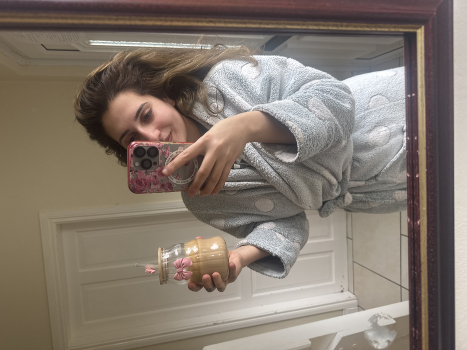 A mirror selfie taken in Armagh, United Kingdom, depicts a female subject from the waist up. She has long, wavy, brown hair and is wearing a light blue or grey plush bathrobe adorned with white polka dots, secured at the waist. In her right hand, she holds a smartphone with a pink floral case and a circular grey phone grip on the back, aimed towards the mirror. In her left hand, she holds a clear, vertically ribbed glass jar with a bamboo lid, containing a layered light brown beverage. A clear straw, featuring a small pink bow charm, protrudes from the lid. A larger pink decorative bow is attached to the exterior of the glass jar. The background, reflected in the mirror, shows light-colored walls and at least two white panel doors. White square floor tiles are visible at the bottom. The mirror itself is framed by a distressed dark reddish-brown frame with gold accents at the bottom of the image.