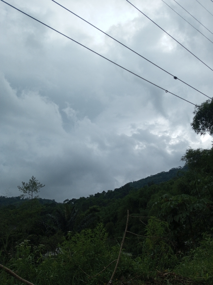 The image depicts an overcast day in Ambakirano, Madagascar, with a dense, green hillside rising from left to right across the midground. The sky is filled with heavy, grey clouds. Three dark utility lines, likely power lines, traverse the upper portion of the frame diagonally from upper left to upper right, with one insulator visible on the second line and a small metal ring suspended from the third. A slender conifer tree with lighter green foliage stands prominently on the left side of the hillside. Further right, a darker, palm-like tree is visible among the general vegetation. The foreground exhibits various green bushes and plants, and a thin, Y-shaped wooden branch is positioned upright in the lower right. No people or animals are visible, and no specific actions or interactions are occurring within the scene. The overall lighting is diffuse, consistent with the cloudy conditions.