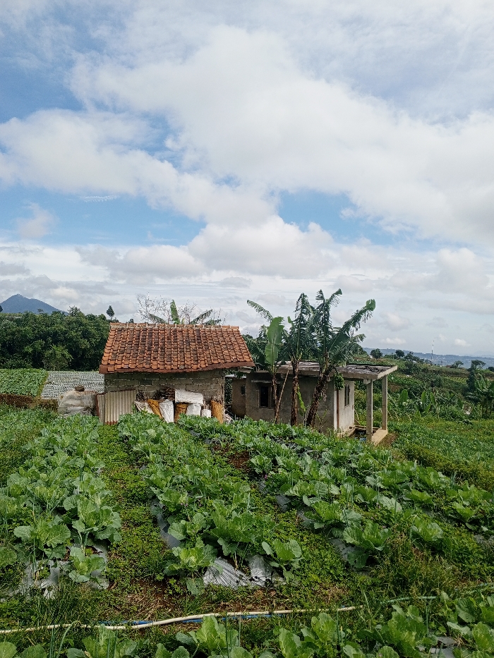 A rural scene shows a small, tiled-roof structure adjacent to a simple building with banana trees nearby. The foreground features a field of leafy green plants, possibly cabbages, growing in rows. A backdrop of rolling hills is partially obscured by clouds. The sky is a mix of blue and white, typical of a partly cloudy day, suggesting a temperate or tropical climate. A distant mountain is visible in the left background.