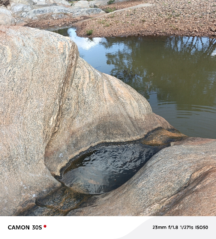 A rock formation with striations holds a pool of water. More water lies beyond, reflecting trees and sky. The rocks are mostly light grey and orange. Another section of land with rocks and small plants is visible in the background. The image was taken with a Canon 30S camera at 23mm f/1.8, 1/271s, ISO50.