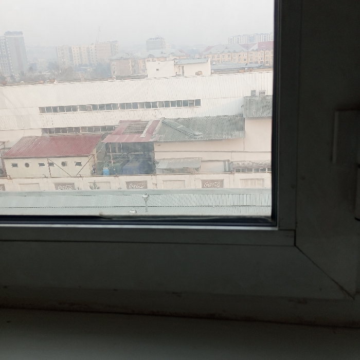 View from a window shows a hazy cityscape dominated by large industrial buildings