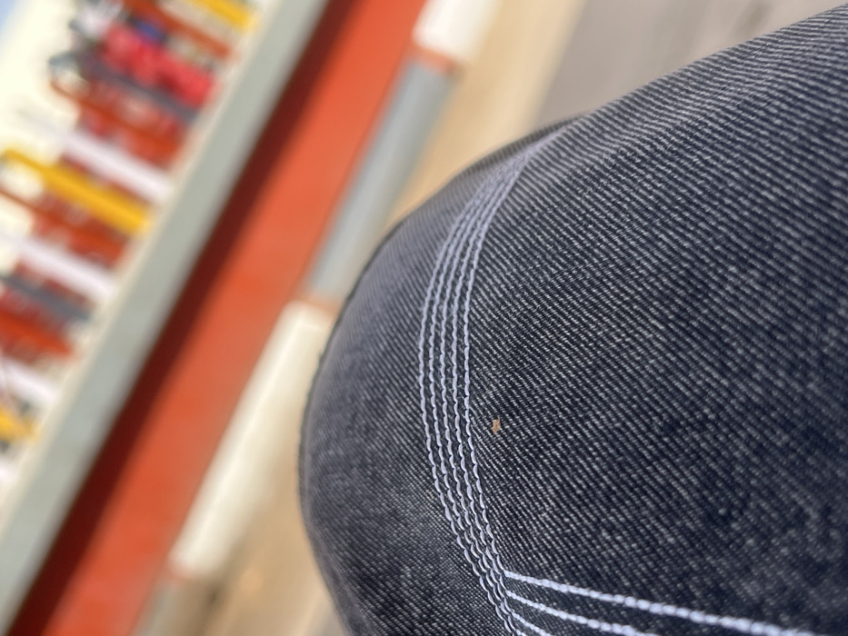 The image displays a close-up, upward-angled view within an indoor commercial establishment, such as a retail store or supermarket. The foreground is occupied by a dark grey denim fabric, consistent with a pant leg, featuring prominent white triple-stitching. A tiny, light brown speck rests on the denim surface. The background is out of focus, showing horizontal shelving units. A distinct orange horizontal bar or shelf edge is visible in the mid-ground. Above this, a shelf holds numerous uniformly shaped, brightly colored items, primarily red and yellow, indicative of packaged products. No specific visual markers within the image identify the location as Jos, Nigeria. No individuals are fully visible; only a portion of one person's clothing is depicted. No actions or interactions are discernible.