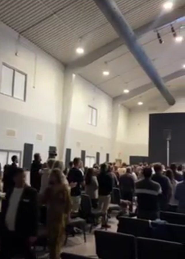 large crowd of people gathered in a spacious, well-lit hall, which appears to be a church or auditorium