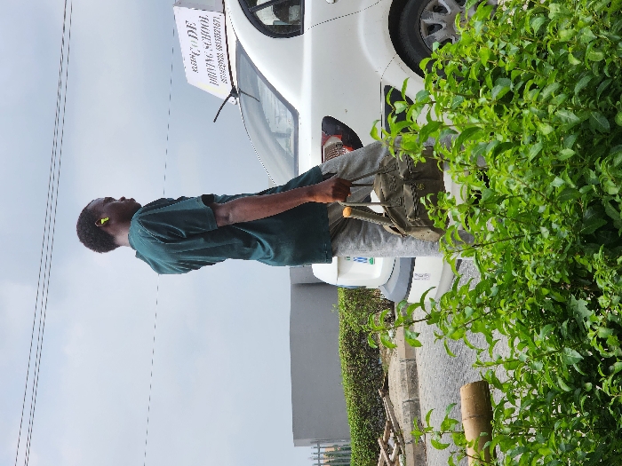 An individual stands outdoors on what appears to be a paved area in Lekki, Nigeria, with green foliage in the foreground