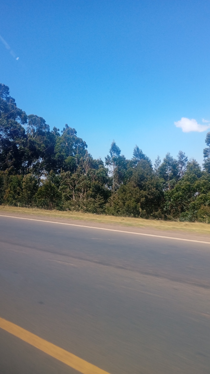 A low-angle, daytime shot features a stretch of gray asphalt road with a faded yellow line running along its edge. Beyond the road, a dense line of green trees forms a barrier against a bright blue sky. A small, puffy white cloud is visible in the distance. The photo appears to be taken from a moving vehicle, as evidenced by the motion blur and the angle of the road.
