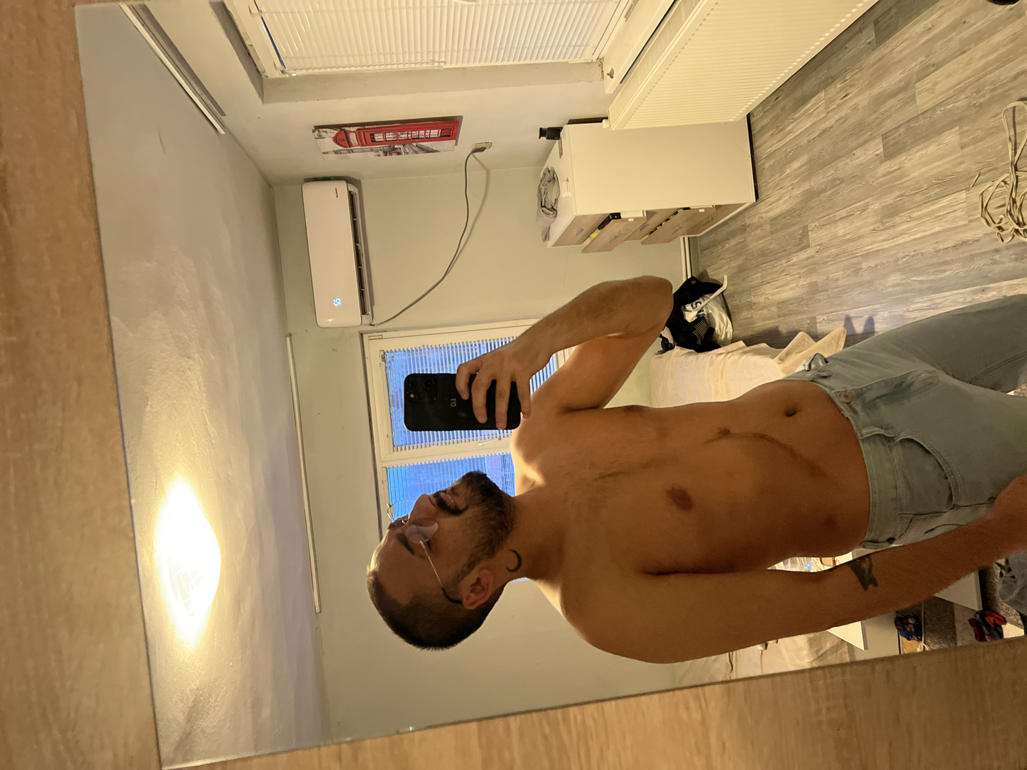 A man is taking a selfie in a mirror in an interior setting. The man is shirtless and wearing light-colored jeans. The background includes a white air conditioning unit, a London-themed picture, a radiator, and flooring that appears to be wood-look laminate. The location of the image cannot be confirmed to be Shumata, Bulgaria.