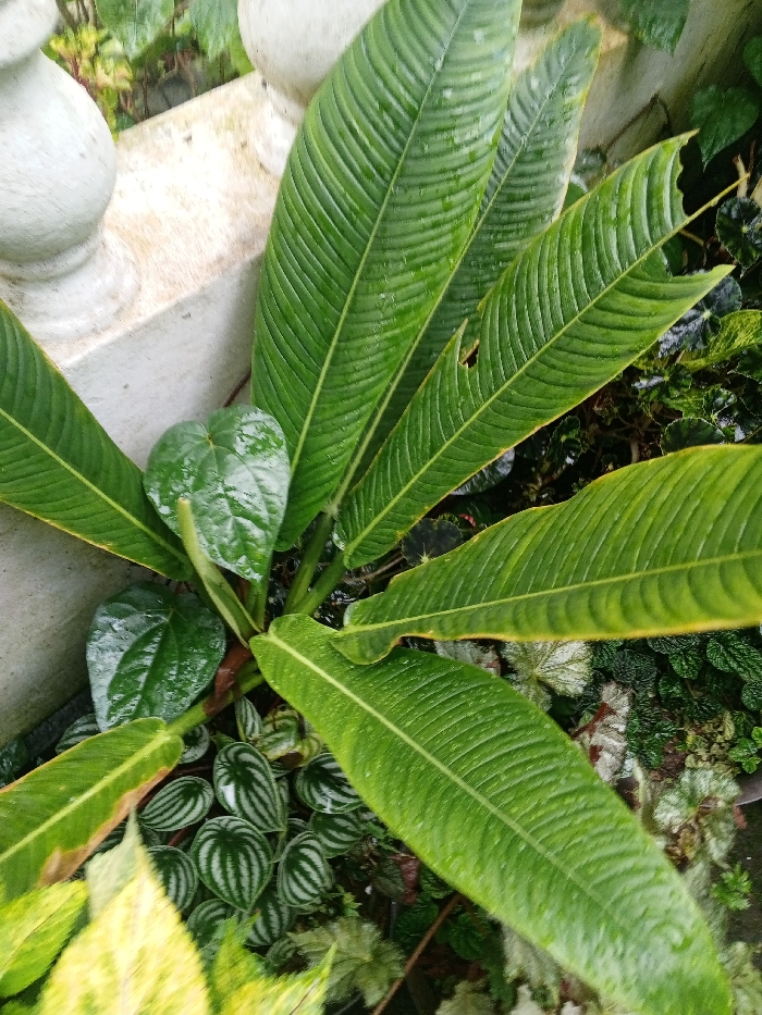 The image displays a close-up, high-angle view of tropical plant life within the city of Khe Sanh Commune, Vietnam. A large central plant features multiple robust, elongated, dark green leaves with prominent parallel venation. Water droplets are visible on the surfaces of these leaves, and some exhibit minor marginal damage or slight yellowing. Beneath this main plant, a cluster of smaller plants with distinctive rounded, silver-green striped leaves, consistent with *Peperomia argyreia*, is visible. Various other green and variegated foliage surrounds these plants. In the upper-left quadrant, a weathered, light-colored concrete balustrade with two partially visible, classically-shaped balusters and a flat upper rail is present, indicating a nearby man-made structure. No people or animals are depicted, and no specific actions or interactions are occurring beyond the natural state of the botanical environment.