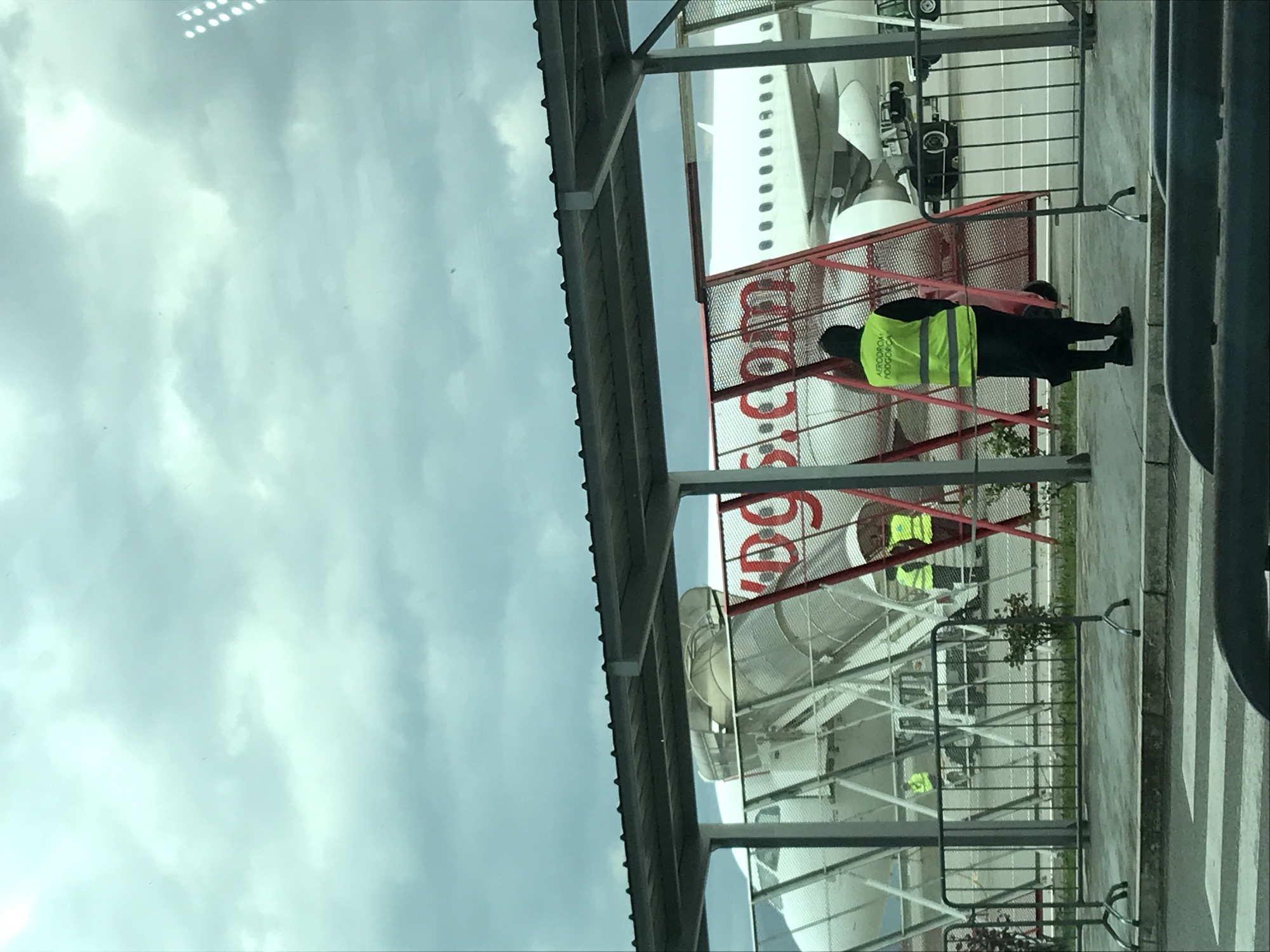 The image depicts an airport apron scene at Podgorica Airport, Podgorica, Montenegro, under an overcast sky. In the immediate foreground, a dark horizontal bar, possibly a vehicle interior element, occupies the bottom edge. Above this, a white zebra crossing is visible on a dark asphalt surface, followed by a grey concrete curb. A black metal crowd control barrier with curved feet stands on the sidewalk. Behind this barrier, small green shrubs are planted. A person is positioned in the midground, with their back to the viewer, facing towards the aircraft. This individual wears dark clothing, including black trousers and a black long-sleeved top or jacket, topped with a bright yellow-green high-visibility vest. The vest clearly displays the text "AERODROM PODGORICA" in black lettering. To the right and slightly behind this person are sections of a red metal barrier with a grid-like pattern. A grey metal canopy structure with supporting beams extends horizontally across the frame, partially obscuring the background. Behind these structures and a wire-mesh fence, a large white passenger aircraft is parked on the tarmac. The aircraft's fuselage displays red lettering, partially visible as "PEGS.com" or "PEGASUS.com". A mobile passenger stairs unit is positioned against a forward door of the aircraft. Several other ground crew personnel, also wearing yellow-green high-visibility vests, are visible on the tarmac near the aircraft, indicating ongoing ground operations. Ground support equipment, including what appears to be a small vehicle, is situated beneath the aircraft's wing and fuselage. The scene is illuminated by ambient daylight under heavy cloud cover, with a bright light source (possibly an airport floodlight) partially visible in the upper right background.