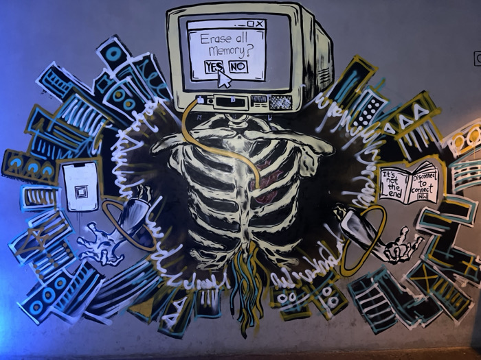 The image depicts a mural painted on a concrete wall, located at the coordinates -1.26 latitude and 36.804 longitude, which corresponds to an area near the University of Nairobi in Nairobi, Kenya. The mural features a skeletal figure with a computer monitor for a head, holding a book in one hand and a phone in the other. The monitor displays a message asking "Erase all Memory?" with "Yes" and "No" buttons. The skeletal figure is surrounded by a multitude of graphic elements, including various rectangles and squares, resembling circuit boards or computer chips. Other text includes "It's not the end" and "Disconnect to connect now," suggesting a theme of technology, digital life, and the disconnect from the real world. The mural is painted in a dark, stylized, and slightly dystopian aesthetic with the use of black, white, yellow, and blue colors. The scene is a visual representation of the potential impact of technology and digital life on human connection and identity.