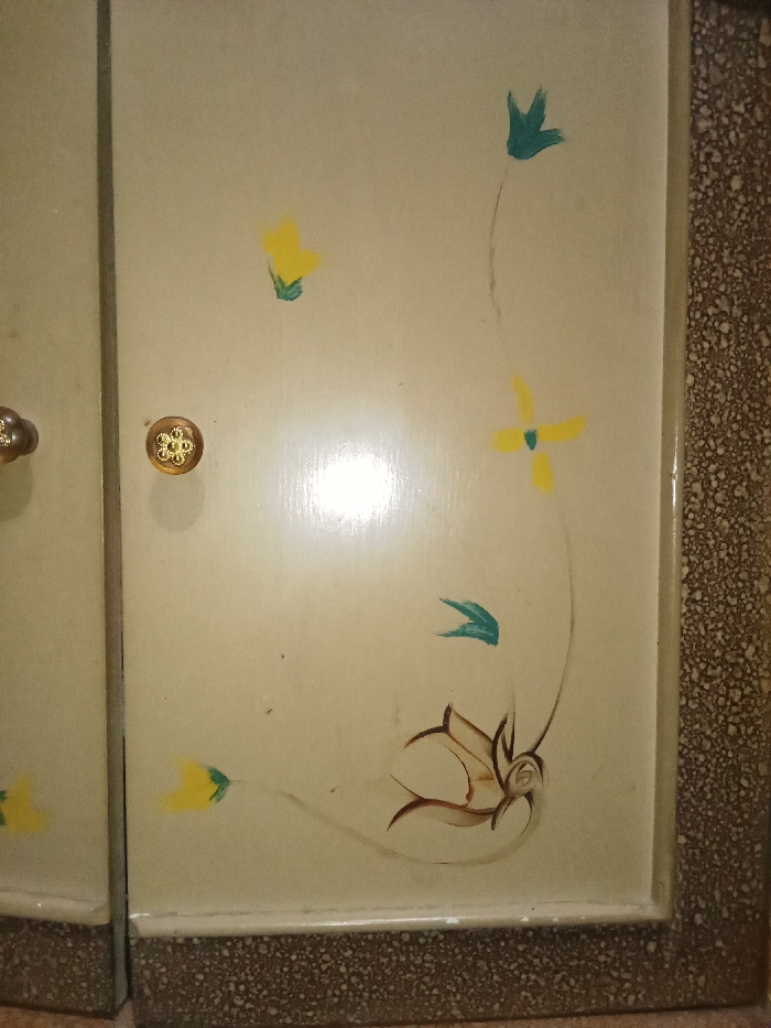 The image displays a close-up, vertical view of two adjacent cabinet or wardrobe doors situated in an interior location in Ciputri, Indonesia. The left door, partially visible, features a round, golden-colored knob with a raised floral or starburst pattern. The right door, which occupies the majority of the frame, is light cream or beige. This door is decorated with hand-painted floral motifs: three distinct yellow flowers with short green stems are located at the upper-left, mid-top, and lower-left sections of the panel. Two teal-colored leaf shapes appear at the upper-right and mid-right. A larger, multi-lobed floral design in shades of brown and lighter beige is positioned in the lower-right corner, from which a thin brown line extends vertically towards the upper-right leaf. A strong, diffuse light reflection is prominent on the central-right portion of the cream-colored door. The bottom edges of both doors and the right edge of the right door are bordered by a dark brown material exhibiting a fine, speckled or granular texture. No individuals or active interactions are present in the scene.