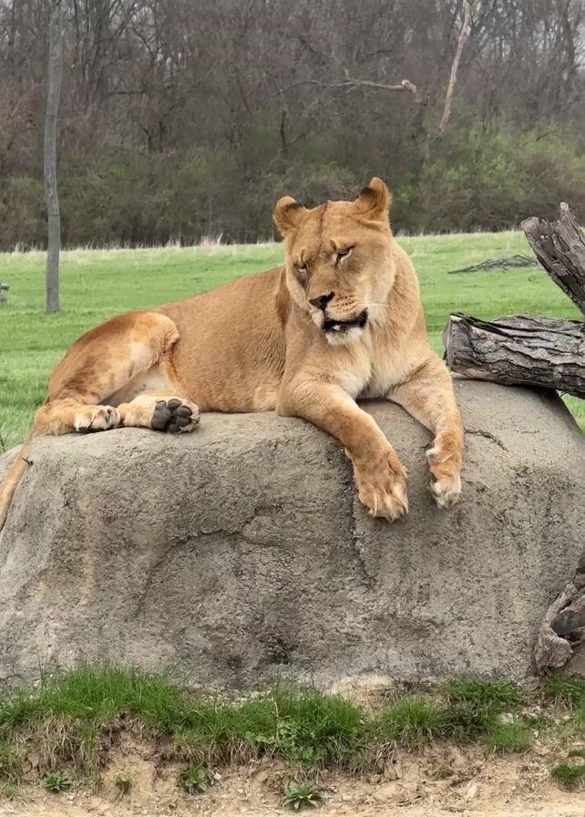 lioness lying on a rock in an outdoor enclosure. The lioness has a tawny coat and is resting with her paws extended. The rock is surrounded by green grass and dirt. In the background, there are trees and some blurred shapes that could be other structures. Some indistinct voices can be heard.