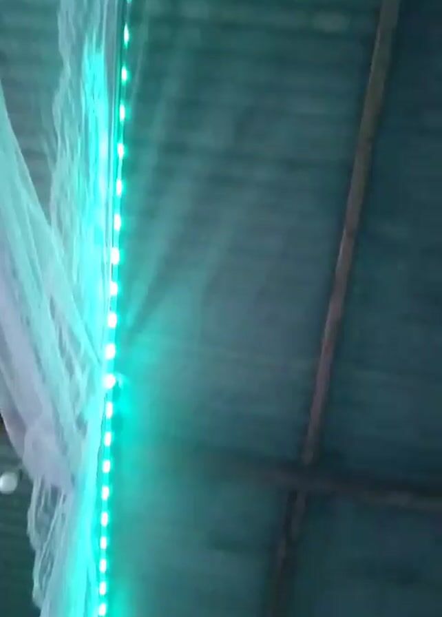 The camera is pointed upwards at a ceiling, focusing on a string of LED lights that change color. The lights transition from purple to green to red. A translucent white fabric, possibly a curtain or drape, is visible on the left side of the frame. The ceiling appears to be made of corrugated metal with wooden beams. The overall lighting in the room is dim.