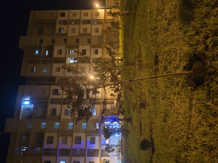 A multi-story, light-colored building with a grid-like facade dominates the left side of the frame. Several windows are illuminated, casting a soft glow. To the right, a field of grass extends, speckled with trees and bushes. The scene is bathed in warm, artificial light from street lamps, which creates stark shadows and adds to the nighttime ambiance.