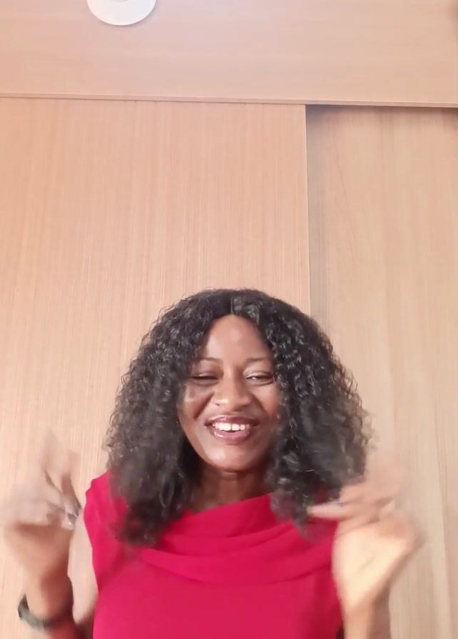 A woman with dark curly hair stands in front of a light wooden wall and a white circular light fixture. She wears a sleeveless red top and is smiling and waving her hands. Music can be heard in the background.