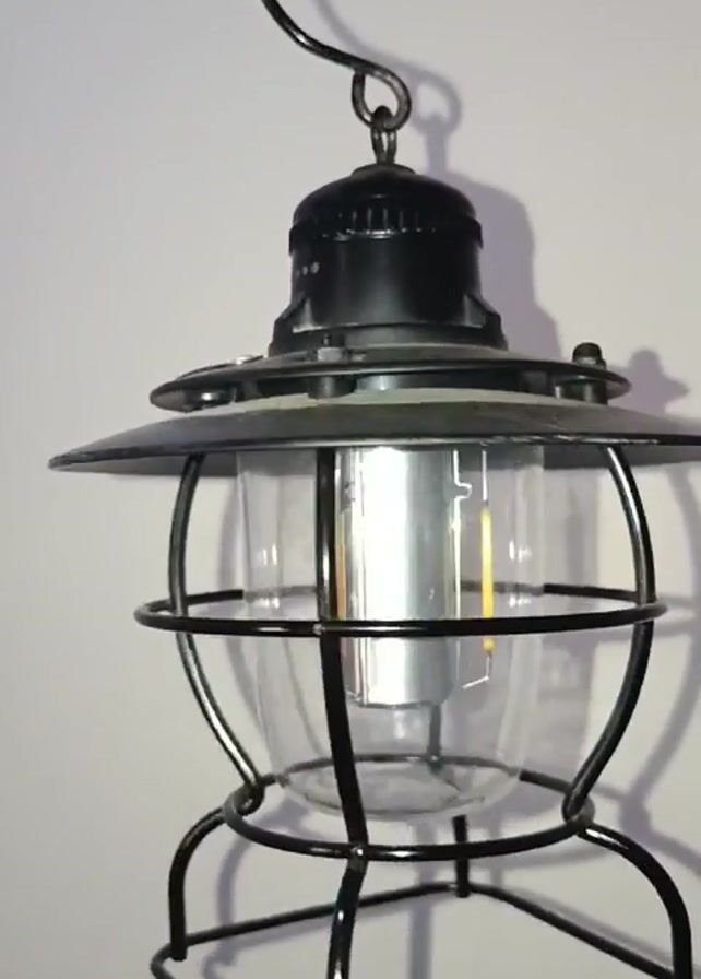 A hand holds up a lantern against a white background. The lantern is black with a clear, glass housing around a bulb that has yellow filaments. The lantern is surrounded by a metal cage with a hook on top for hanging. The hand is dark-skinned.