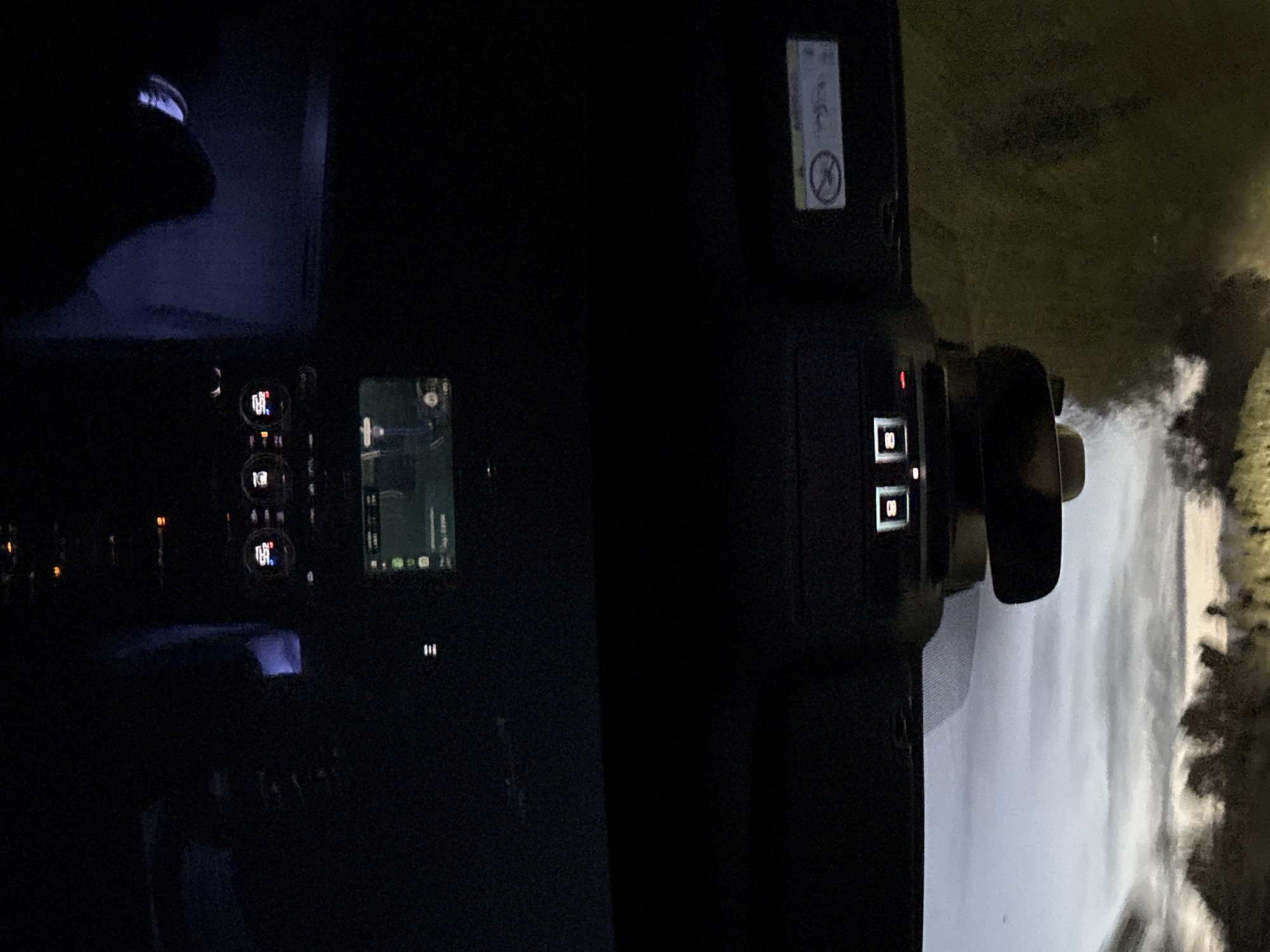 A nighttime photograph taken from inside a vehicle in Pétange, Luxembourg, looking forward through the windshield. The upper section of the image details the vehicle's interior: a dashboard with a central infotainment screen illuminated and displaying a navigation map interface, and an overhead console with two distinct square illuminated buttons. A rearview mirror is suspended below the console. A partially visible airbag warning label is present on the passenger side interior trim. Ambient blue light emanates from within the cabin. The lower section of the image, viewed through the windshield, depicts an outdoor environment under low light conditions, characterized by a cloudy twilight sky above the dark silhouettes of trees and vegetation along a distant horizon, indicative of a rural or undeveloped area. No individuals or specific actions are depicted.