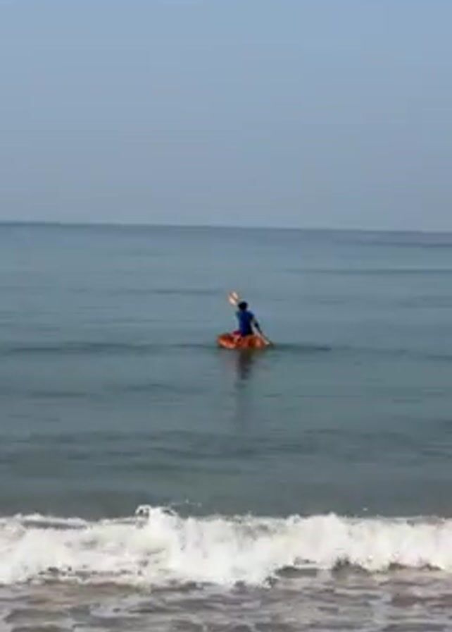 A person rows an orange raft in the ocean. The person is facing away from the viewer and wearing a blue top and dark-colored shorts. They use a double-bladed paddle to propel themselves through the water. The ocean is calm, with gentle waves approaching the shore. The sky is clear and pale blue. The sand of the beach is visible in the foreground.
