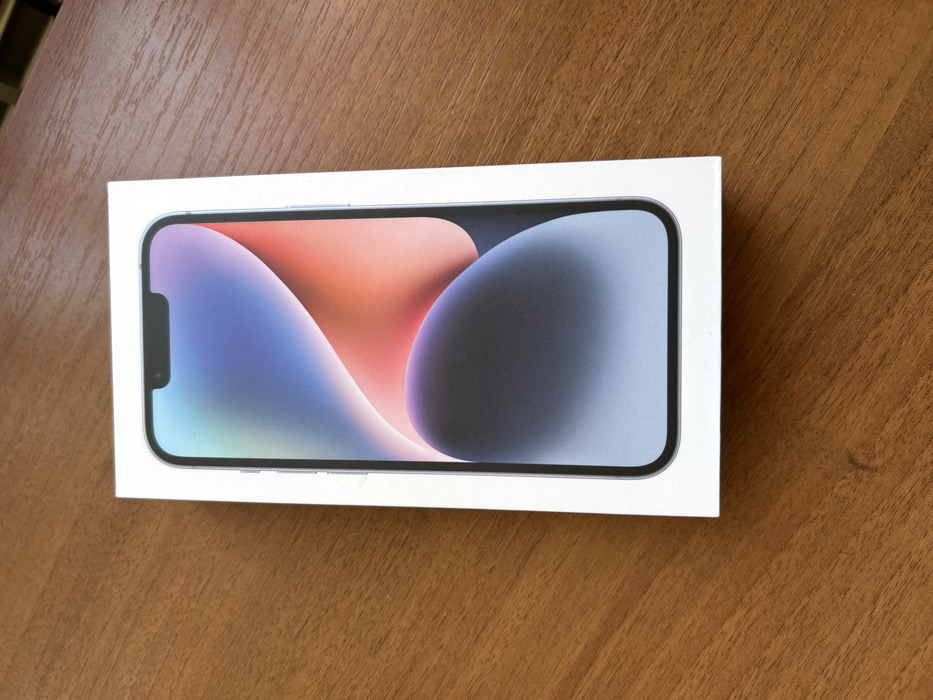 A white retail box, consistent with an Apple iPhone 14, is centrally positioned and vertically oriented on a medium-brown wooden surface
