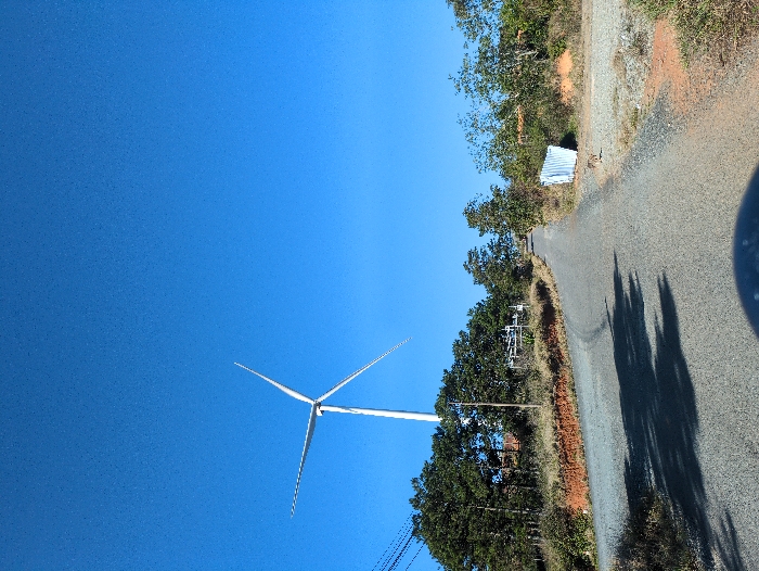 The image captures a rural landscape in Trường Thọ, Vietnam, under a clear, cloudless blue sky. A large, white, three-bladed wind turbine stands prominently in the upper left, its lower tower partially obscured by a cluster of dark green evergreen trees. A narrow, two-lane road, appearing to be paved with asphalt and gravel, curves gently uphill from the foreground towards the background. Dark, elongated shadows are cast across the surface of the road. On the left side of the road, behind the initial tree line, utility poles with power lines are visible, along with a white metal installation that appears to be part of a utility or monitoring station, and a glimpse of a reddish-orange rooftop. The ground along the roadside features reddish-brown earth and sparse vegetation. On the right side of the road, a makeshift structure made of corrugated metal sheets, painted with white and blue stripes, is situated. A small, light-colored dog is visible standing on the dirt shoulder of the road, adjacent to this corrugated structure. The immediate foreground contains a blurred, dark, curved object, indicative of the camera's mounting or vehicle. No people are visible in the scene.