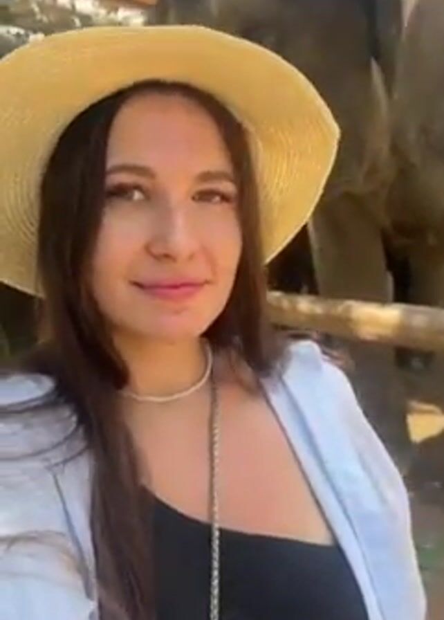 A woman with long brown hair wearing a straw hat, a white shirt, and a black top takes a selfie with an elephant in the background