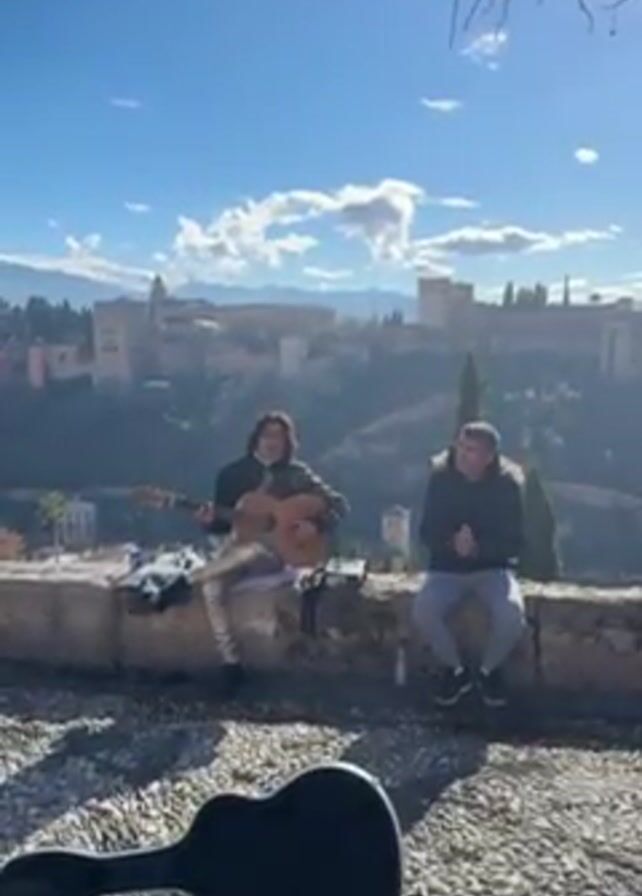 A wide shot captures two men sitting on a stone wall in front of a scenic view. The man on the left plays an acoustic guitar, while the man on the right claps along to the music. An open guitar case lies on the cobblestone ground in front of them. In the distance, a large historical building sits atop a hill, framed by mountains and a bright blue sky with scattered white clouds. A bare tree branch partially obscures the top right corner of the frame. The scene is well-lit, casting shadows from the foreground objects.