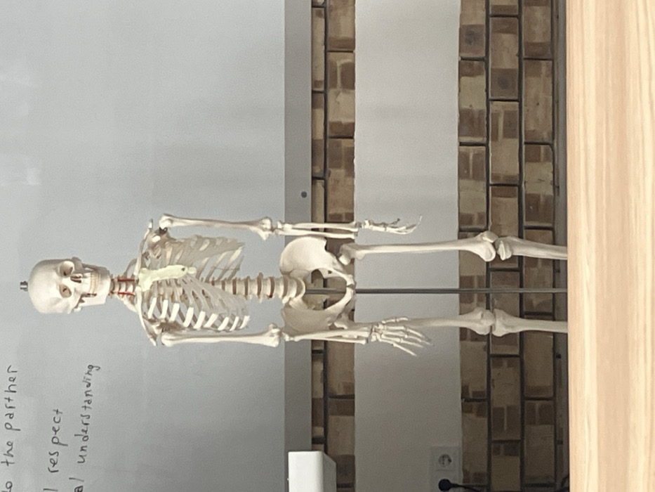 A sideways view of a human skeleton model. The skeleton faces left, displaying its skull, rib cage, and pelvic bones. Arms are outstretched, and legs extend straight down. The skeleton is attached to a vertical metal stand. A gray wall is visible on the left, featuring text. A brick wall runs behind the skeleton on the right, and a light-colored wooden panel is partially visible on the rightmost edge.