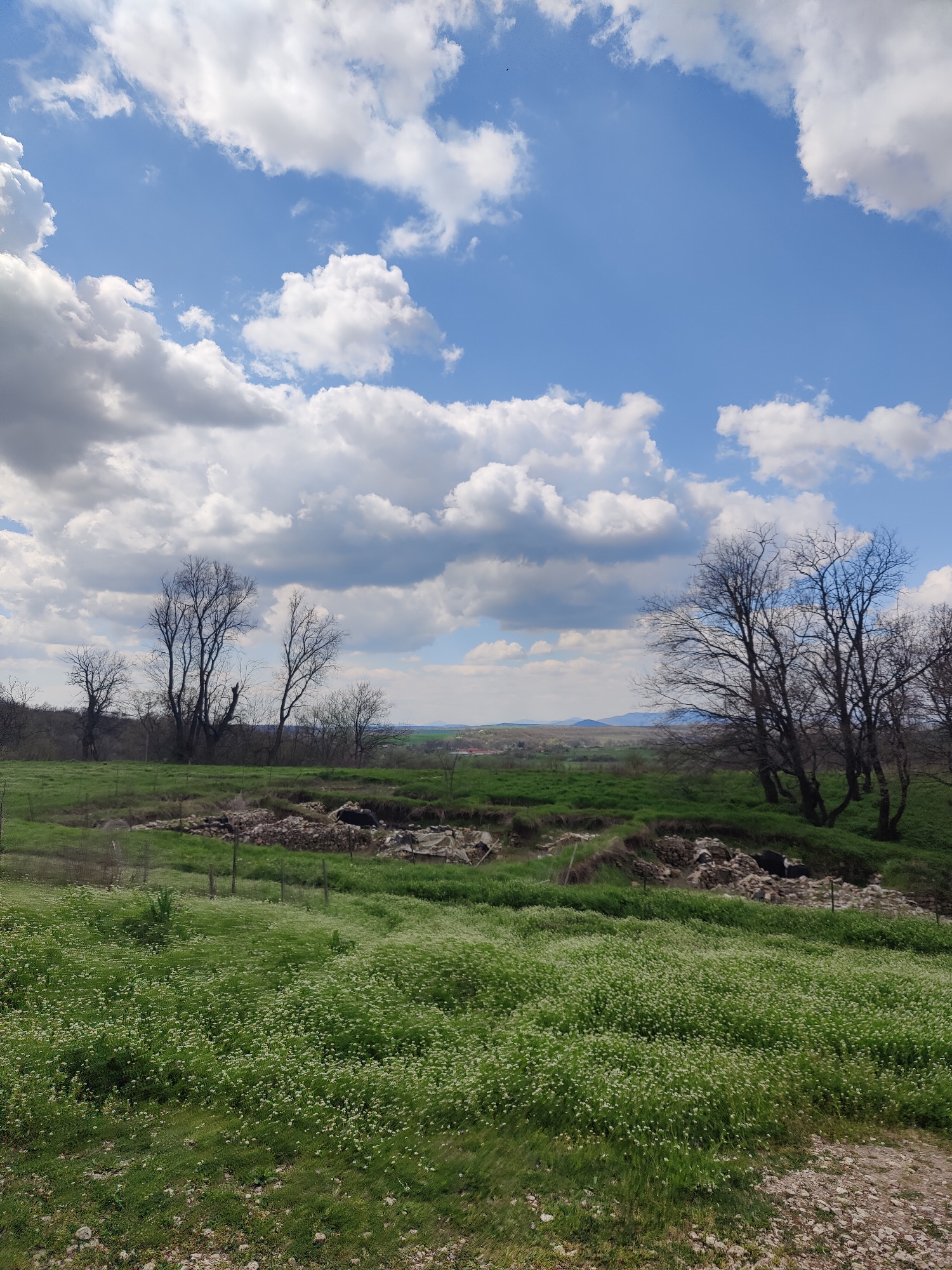 The image depicts a field in Gorski Izvor, Bulgaria. The foreground is dominated by green grass interspersed with small white flowers. A dry ditch or depression runs across the middle ground, revealing exposed earth and stones, and some additional green vegetation. Behind the ditch, a cluster of bare trees with visible branches rises against the sky. In the distant background, a faint landscape, potentially including hills or low mountains, is visible under a blue sky with scattered white clouds. No people or animals are visible in the image.