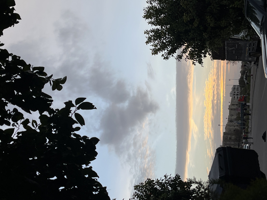 A captivating scene displays a sky divided: one side filled with grey and white clouds, the other bathed in the warm hues of a setting sun. Silhouetted trees frame the view on either side, their dark foliage contrasting with the brightness beyond. On the right, buildings line a street, hinting at urban life, while the sunset paints the scene with gold. The image captures a moment of serenity amidst the daily bustle.