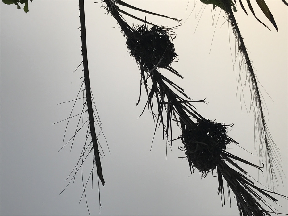 Silhouetted against a pale, overcast sky are fronds of a palm tree. Two round bird nests sit nestled within the fronds, constructed from twigs and other materials. The stark contrast emphasizes the delicate structure of the nests and the spiky texture of the fronds. Thin, bare branches extend from the fronds, adding to the stark, skeletal appearance. The scene evokes a sense of tranquility and natural simplicity.