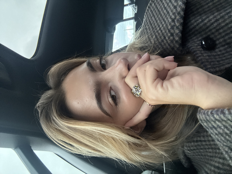 A single individual, an adult female, is depicted from the upper torso upwards, seated inside a vehicle. She has light brown hair with blonde highlights and darker roots, parted on the left side, with visible eyelashes and eyebrows, and a small mole on her forehead above her left eyebrow. Her right hand is raised, with fingers partially covering her mouth and her palm resting against her left cheek. A large, ornate ring with multiple facets and stones (appearing yellow, clear, and green) is on her right ring finger. A second, thinner ring with red elements is visible on her left ring finger. She is wearing a dark grey or charcoal-colored coat with a textured fabric and a visible black button. The background indicates a vehicle interior, with a black overhead panel and the edge of a sunroof revealing an overcast sky. A blurry exterior view through a rear window shows a grey sky and indistinct ground features. The location is an unknown vehicle in Unknown, Unknown.