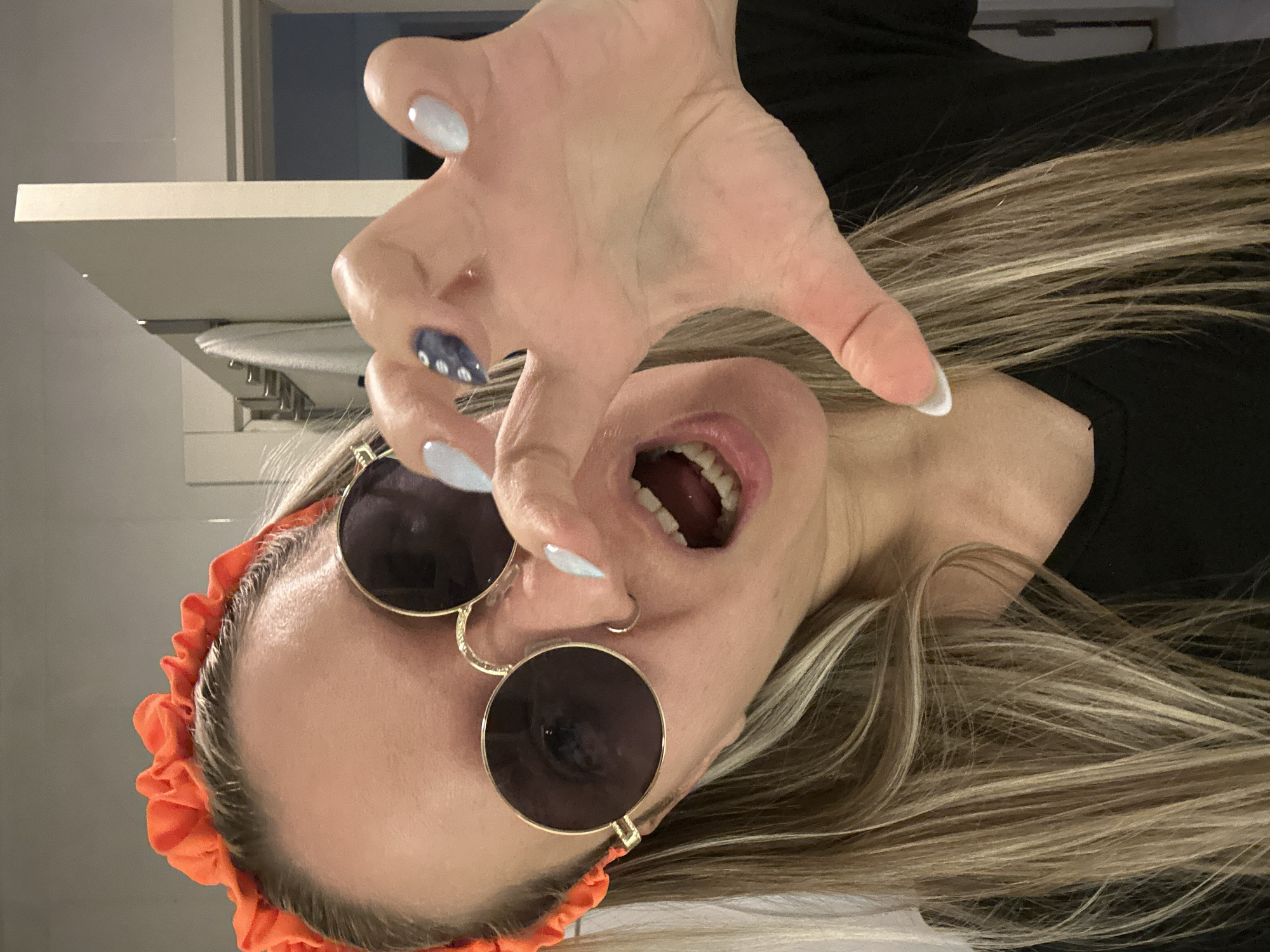 A close-up photograph captures a female individual in an indoor setting, identified as Esenyurt, Turkey. The subject has long, light brown hair with blonde highlights and wears an orange ruffled headband. She is wearing round, black-lensed sunglasses with gold frames, obscuring her eyes. A silver-colored nose ring is visible on her right nostril. Her mouth is open, revealing her teeth. She wears a black V-neck garment. Her right hand is extended towards the camera, fingers splayed in a "claw-like" gesture. Her fingernails are painted a light blue or white shade, with the middle fingernail featuring a darker blue design with white dots. The background shows a light-colored wall, a chrome wall-mounted towel rack with a white towel, and a partially visible doorway.