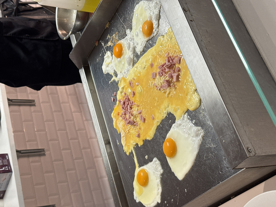 - "A griddle displays fried eggs, some sunny-side up, others with broken yolks, alongside scrambled eggs topped with chopped ham and shredded cheese" by FM-BZgWn2, licensed under CC BY 4.0