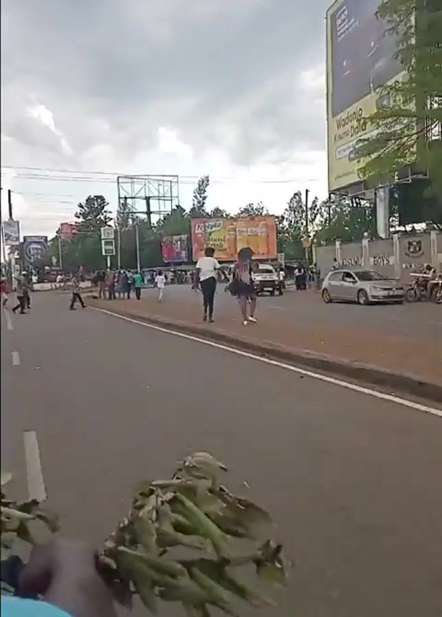 n overcast day on a paved road where people are congregated at an intersection. The individual recording is holding a handful of green plants. In the distance, there are people walking and some vehicles including a yellow tuk-tuk, a white van, and several motorcycles. Billboards featuring various advertisements are visible in the background. As the video progresses, the camera pans to the right, revealing more people gathered at the intersection. The crowd is mixed with people standing, sitting, and walking. A large truck passes by. There are also motorcycles parked on the side of the road. The video ends with a view of more people and motorcycles lining the street.