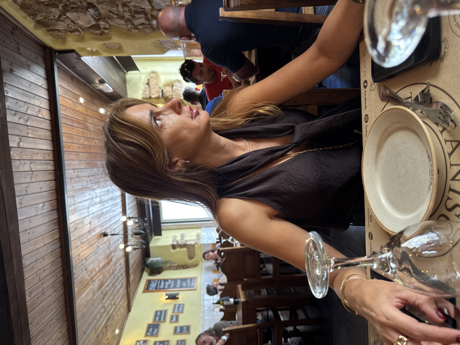 The image displays the interior of a restaurant identified as "Anis" in Torres Vedras, Portugal. A woman with light brown hair, wearing a dark, possibly satin, sleeveless top, is seated at a wooden table in the foreground. She is observed from the chest up, looking towards the right side of the frame. Her left hand, adorned with rings and gold bracelets, rests near an inverted clear wine glass. An empty, beige-colored ceramic plate, a silver fork, and a knife are present on the placemat in front of her. The placemat bears the restaurant's name, "ANIS," along with social media icons and a phone number. In the background, other restaurant patrons, including a bearded man, a woman, and a bald man, are seated at additional wooden tables. The restaurant's decor features a planked wooden ceiling, yellow-painted walls with sections of exposed rough stone, a dark metal chandelier, and various framed wall decorations. Bright natural light enters from an opening at the rear of the establishment.