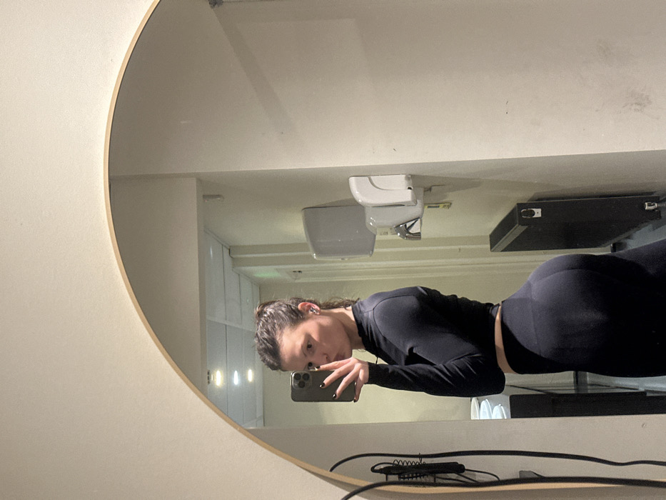 A woman in black athletic wear takes a mirror selfie in a bathroom