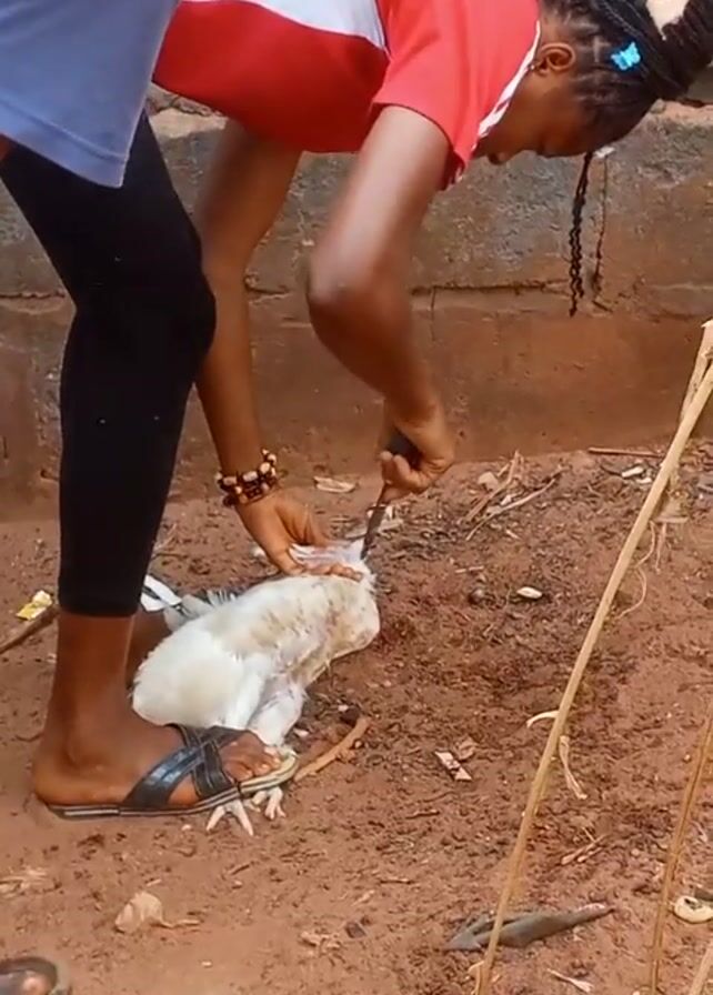A young person wearing a red and white shirt is holding a chicken and cutting its neck with a small knife. They are wearing black leggings and sandals. Another person is standing nearby wearing a blue shirt and black leggings. There is a young child watching. They are standing on a dirt ground outside next to a low wall. There are some sticks and dead leaves on the ground.