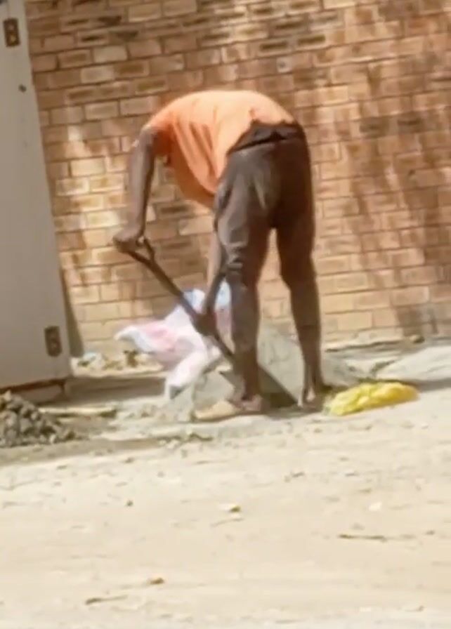 A man wearing an orange shirt and dark shorts is mixing something on the ground with a shovel near a brick wall. There is a bag, possibly containing material for mixing, a yellow bag, and some other items on the ground near the man. A white door or panel is leaning against the wall. The ground appears to be dirt or gravel. The scene seems to be outdoors during the day with sunlight casting shadows on the wall.