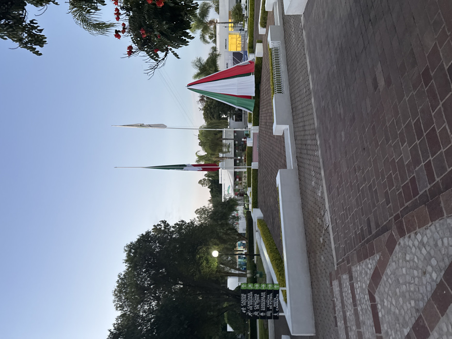 This image depicts a well-maintained outdoor plaza or entryway within the **Club Campestre Irapuato** in Irapuato, Mexico, likely during early morning or late afternoon. The scene is devoid of people. In the foreground, the ground is paved with reddish-brown rectangular interlocking pavers, arranged in a running bond pattern. A decorative border of lighter, irregularly shaped pavers is visible in the lower-left corner. Low white concrete walls with some sections featuring white decorative metal railings define the edges of planters filled with manicured green hedges. To the left, a white signpost with black text and directional arrows points towards various facilities: "CADDIE HOUSE," "CANCHAS DE SQUASH" (squash courts), "CANCHAS DE BASQUETBOL" (basketball courts), "CANCHAS DE FUTBOL" (soccer fields), and "PISTA CAMINATA" (walking track). Behind this sign and the hedges, a large, mature tree with dense green foliage stands, illuminated by a spherical lamppost. In the midground, a central paved area features two flagpoles. The leftmost pole flies the green, white, and red Mexican flag at half-mast. The adjacent pole flies a white flag with an indistinct emblem, also at half-mast. To the right of the flagpoles, a prominent conical structure, approximately 3 meters high, is draped with vertical strips of green, white, and red fabric, mimicking the Mexican flag's colors. The background reveals a series of white buildings with green accents, consistent with a clubhouse or administrative facilities. Palm trees and other varied green foliage are scattered throughout. A vibrant red flowering plant hangs into the frame from the upper right. The sky is a clear, pale blue, transitioning to a lighter hue near the horizon, indicating soft, ambient lighting.