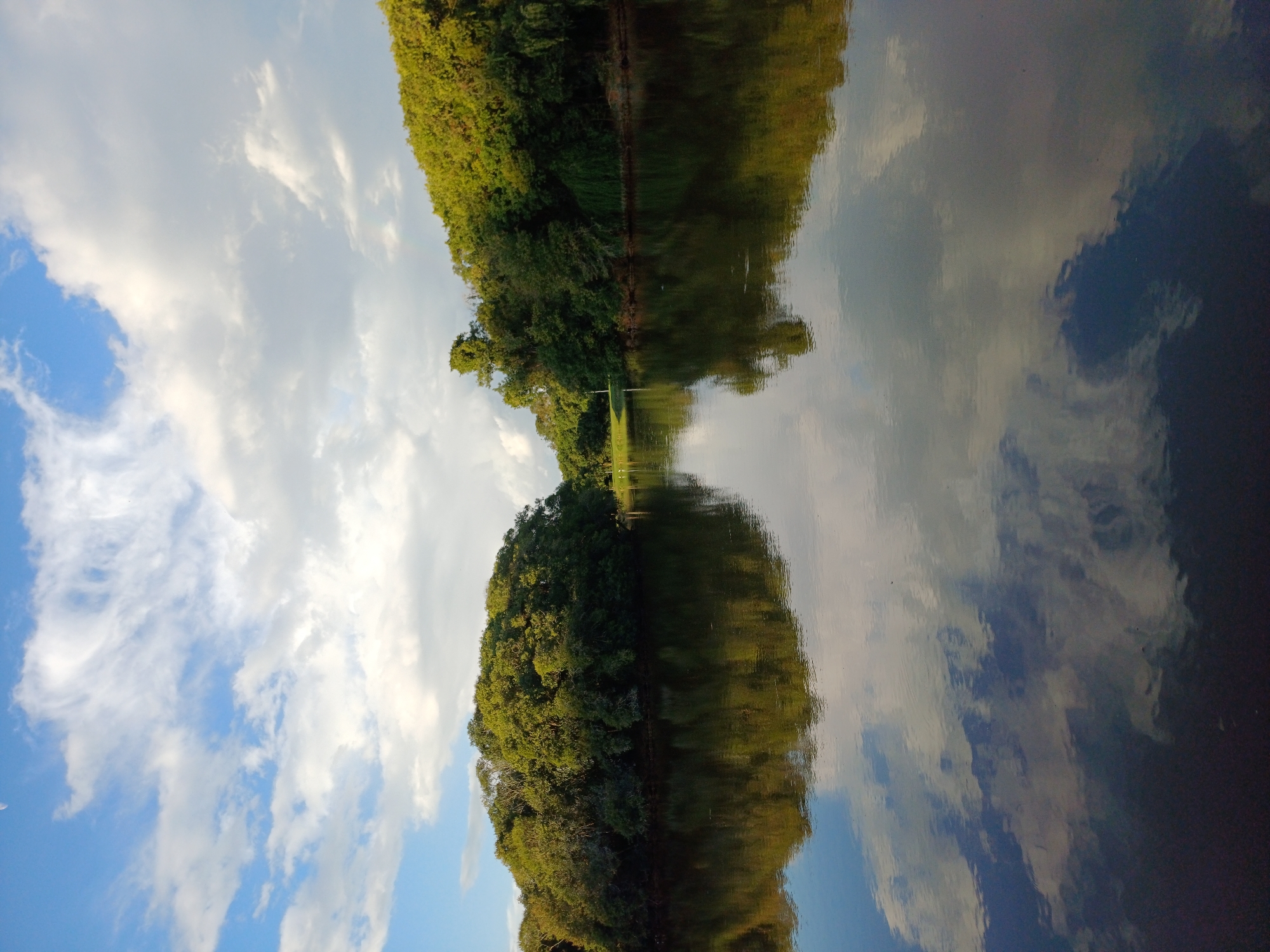 The image depicts a serene natural landscape within Parque Barigui, located in Curitiba, Brazil. A wide body of calm water, likely a lake, occupies the lower two-thirds of the frame, acting as a mirror. Its surface reflects the sky above and the dense, verdant foliage lining its banks. The sky, visible in the upper portion, is partly cloudy, displaying patches of clear blue interspersed with large, white and light grey cumulus clouds. Thick, green trees and bushes form a continuous, natural border along both visible shores, extending into the mid-distance. The reflections on the water are clear and undistorted, showing the identical cloud patterns and tree line. No human figures, man-made structures, or discernible wildlife are present in the observable scene.