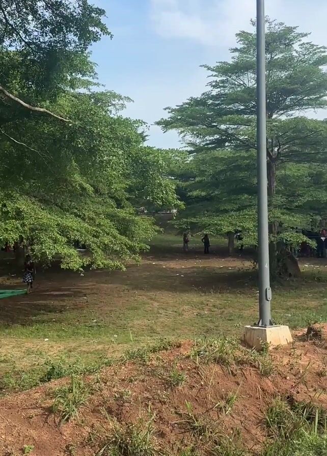 park with green grass, tall trees, and a few people. A dirt hill is in the foreground. In the mid-ground, several people are gathered under a large tree, some standing and some sitting on a green mat. In the background, more trees and people can be seen in the distance. A tall light pole stands near the edge of the park. The sky is partly cloudy.
