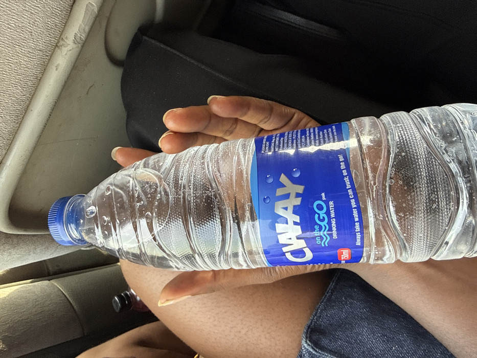 A clear plastic "CWAY on the GO pak" drinking water bottle, 750ml, with a blue screw cap, is held by a person's light-brown skinned hand. The hand exhibits well-maintained, unpolished fingernails. The bottle label is blue and white, displaying "DRINKING WATER" and the slogan "Always take water you can trust; on the go!". Detailed text on the label mentions "CWAY NIGERIA" and "FCT ABUJA" as part of the producer's address information. To the left, a section of a dark-skinned leg, sparsely hairy, is visible, partially covered by blue denim material, likely shorts or jeans. In the upper left background, a small, dark-colored bottle with a red or purple label is partially seen. The scene is set inside a vehicle, indicated by light beige or grey fabric upholstery visible in the background and a black, possibly padded, surface on the right. This scene is located in the city of Keffi, Nigeria.