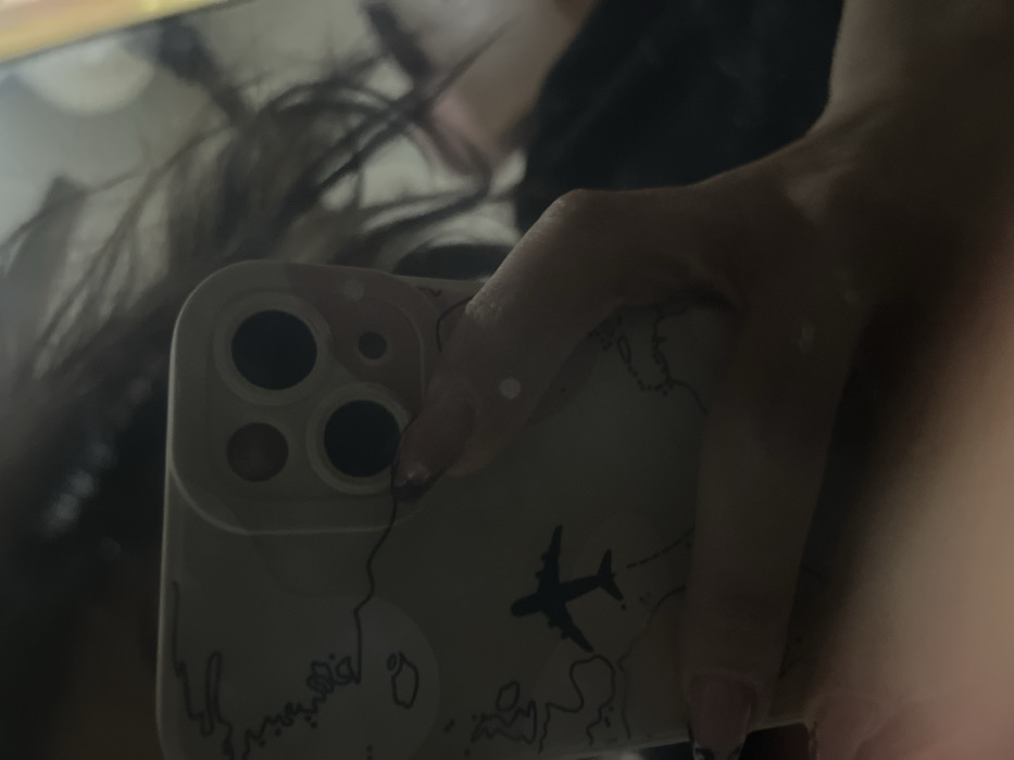 A hand holds a smartphone with a pale case. The case has a world map design with a black airplane graphic. The phone's triple-camera lens is visible in the upper left corner. The hand's skin tone is light. Dark hair and a blurred background suggest the image is a selfie. The lighting is somewhat dim, creating shadows and reflections on the phone's surface.