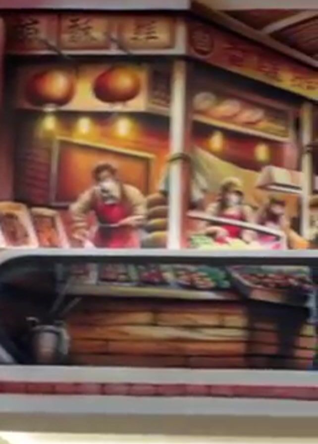 A low-angle pan across a wall mural depicting a bustling Asian market scene